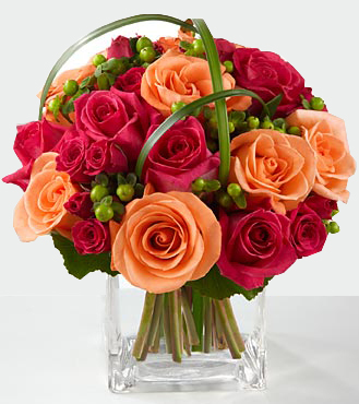 Hot pink roses and spray roses share the spotlight with bright orange roses, green hypericum berries and lily grass blades gorgeously arranged in a clear glass vase. Depending on availability, components such as vase color and design, may vary.