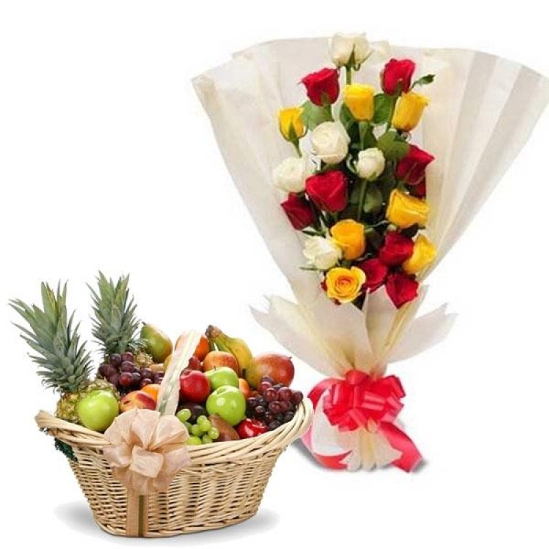 10 Mixed Roses and 2 Kg Mixed Fruits with Basket
