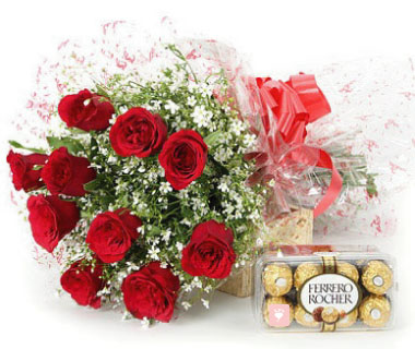 An enticing flower bouquet of 10 Red roses. Make this day memorable with these elegant roses and delicious chocolates.