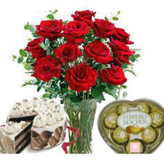 10 Red roses in Vase, 1/2 kg Buttur sotch cake and 16 pc ferrero Rocher