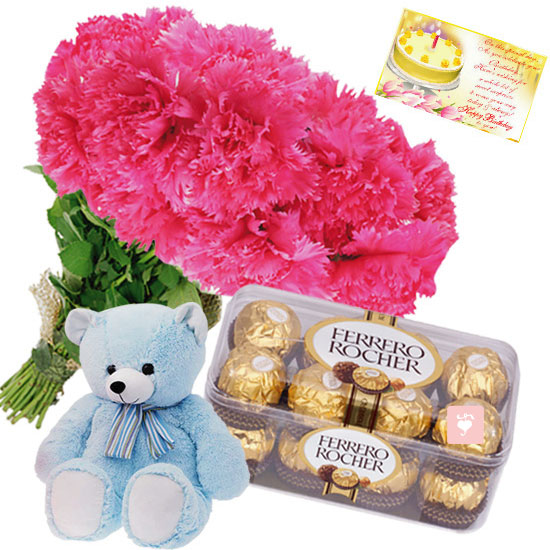 Check out this exclusive combo, consisting of 12 pink carnations, one teddy bear and a pack of Ferrero Rocher chocolates. While those fresh pink carnations, tied neatly in a bouquet, will express your never-ending and sincere love towards its receiver, teddy bear and Ferrero Rocher chocolates are a sign of true admiration and respect. You can gift this combo to anyone for expressing gratitude and appreciation, and conveying love to them. So, what are you waiting for? Place an order right now before stock ends!