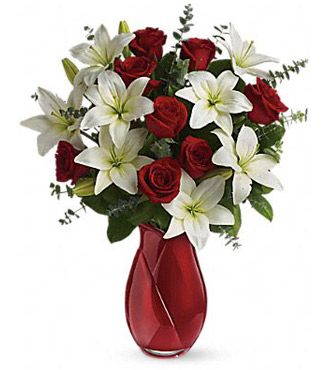 Her friends will be envious when they see her spectacular gift of fragrant roses and lilies in this magnificent hand-blown art-glass vase etched with an exquisite “rosebud” design. She’ll appreciate you even more. The romantic bouquet includes red roses and white lilies accented with salal and spiral eucalyptus. Delivered in hand-blown art-glass vase with a sculpted “rosebud” design. Approximately epending on availability, components such as vase color and design, may vary.