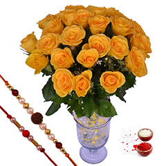 Your Gift Contains:• A Flower Bunch of 18 Yellow Roses with Glass Vase• 1 Rudraksha Pearl Rakhi• 1 Elegant Beaded Pearl Rakhi• Roli and Chawal