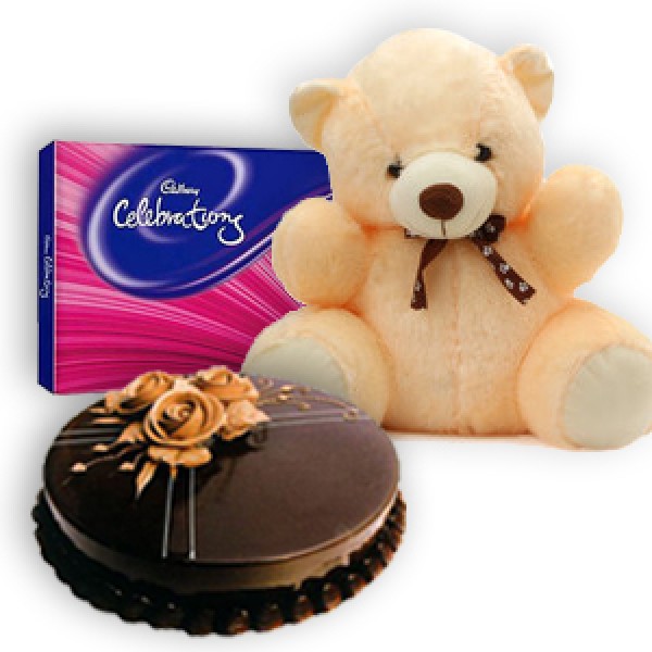 A complete combo of 1kg chocolate cake, 12 inch teddy bear and cadbury celebrations for your cute and lovely ones making them happy and reviving their lives.