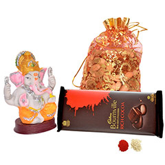 It is a delightful Bhai Dooj combo that includes 200gms of mixed Dryfruits,a Bourville chocolate and Lord Ganesh idol with roli and chawal. Its a perfect Bhai dooj gift for both for brother or sister.