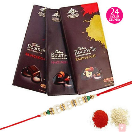 Make your brother feel extra special on this Rakhi , by sending him this exclusive Rakhi Combo from Online Delivery. 3 Bournville chocolate 80Gm (95Rs) and one Rakhi with Roli & chawal pack. Rakhi Design may vary as per availability.