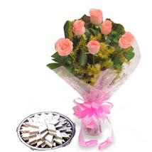 . Bunch of 6 Pink Roses in a cellophane packing with pink ribbon bow and 500gm Kaju Katli