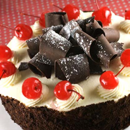 This Black Forest Cake is a German favorite and garnished with maraschino cherries and bittersweet chocolate shavings. Cake crumbs cover the sides of the Black Forest Cake. Serves 12