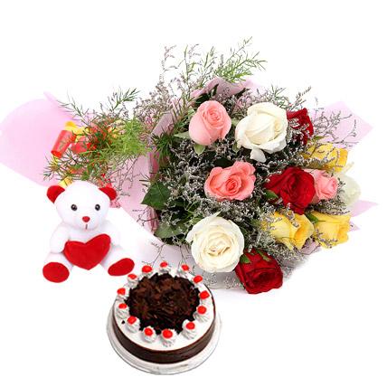 The perfect assortment of colored roses to make an ordinary day special for your loved ones. The product consists of : A bunch of 10 mix Roses, 1kg black forest cake and (12-inch teddy bear) of different colors, arranged beautifully by expert florists.