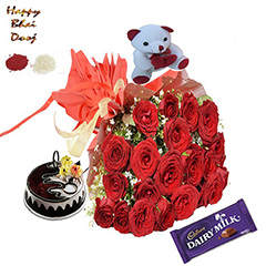 A bunch of 20 red roses symbolise your love, exotic chocolate Cake (1/2 Kg) to celebrate your day. A teddy of 6 inches with a cadbury chocolate to increase sweatness in your life. All together we pleasure to make your day special. Free Roli & Chawal on this auspicious Occasion.