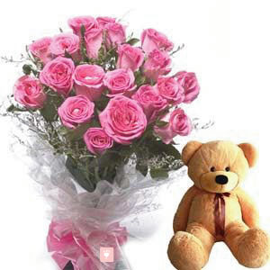 A bunch of 25 pink roses and 6 inch brown teddy bear to show your love for your cared and loved ones with lots of love and concern for them.
