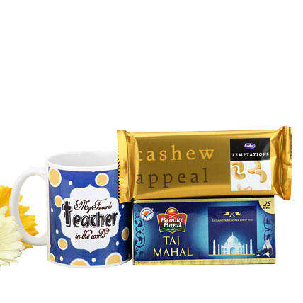 A gift to refresh and relish, this combination of a beautiful Printed Mug quoting “My Favourite Teacher in the World”, Temptation Cashew Appeal Chocolate and Taj Mahal Tea bags will definitely make your teacher happy.