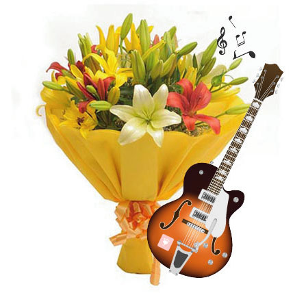 Gorgeous 8 colorful Asiatic Lilies (3 Yellow, 3 Red, 2 White) with green fillers in yellow paper packing and yellow ribbon create an atmosphere to thank your someone special for being there. . Adding to the surprise is our in-house Guitarist's vocal performance at the time of delivery.