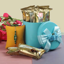 A green embellished rakhi clubbed with yummy chocolate treat makes this arrangement the optimal choice of a rakhi gift hamper. Order this to have it delivered to your brother who is miles away from you this Raksha Bandhan. Make him feel at home and enjoy the festivities of rakhi.