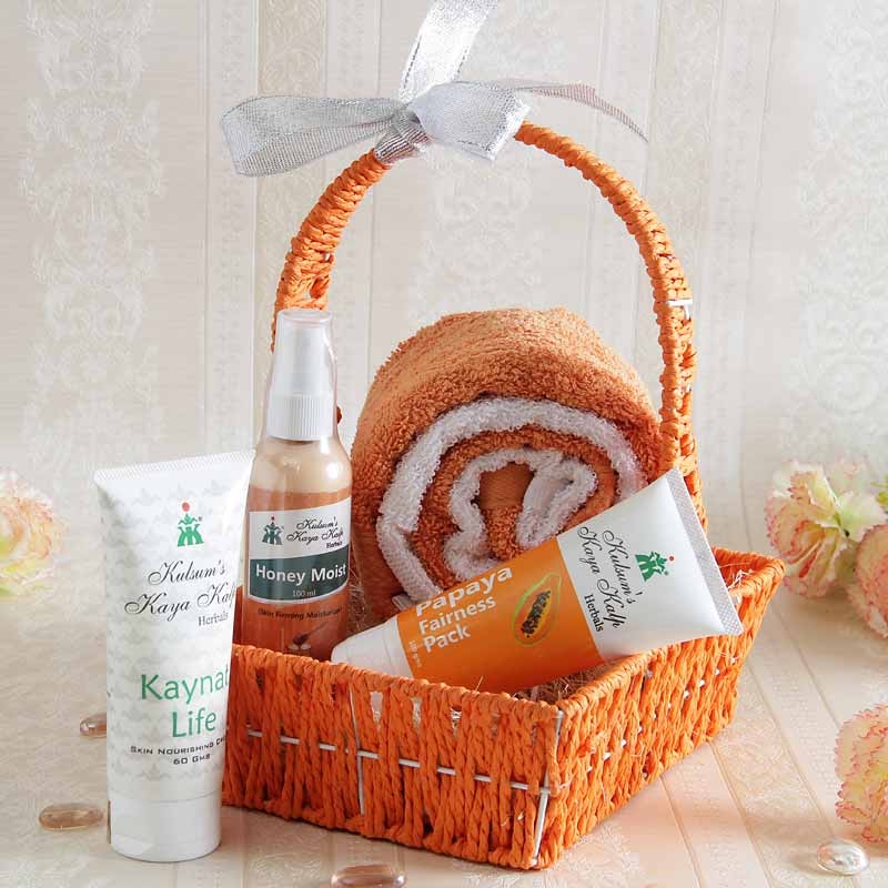 If you are clueless as what to gift your loved ones on special occasions then we have a perfect gift option for you. This is an amazing hamper of face care essentials that comprises of a papaya flavored fairness pack, honey flavored moisturizer and a skin nourishing cream all from the popular brand Kaya Kalp. This absolutely must have skin care essentials hamper is perfect to delight your special ones with on events like wedding anniversary, Valentine Day and so on. Product details: orange basket filled with 2 hand towel (orange and white), papaya Fairness face pack(10ml), Honey moist (100 ml), Kaynat life (60 gm) skin nourishing cream
