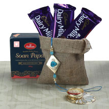 Blue is the color of calmness and friendship and thus would make your brother feel better. Along with this rakhi, we also have packed carefully three Cadbury chocolates and a box of soan papdi for a lavish celebration. Your Gift Contains: