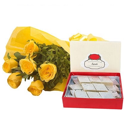 Bunch of 10 Yellow Roses with 1/2 Kg Kaju Katli