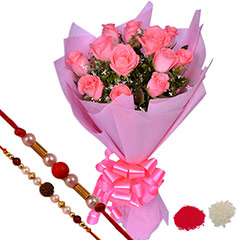 combo gifts with Pink bunch of pinck roses with two beautiful designe Rakhis is prefect gifts to your brothers feel surprised on the Raksha Bandhan. Your Gift is:• A Flower Bunch of 12 Pink Roses wrapped with pink paper & ribbon• 1 Rudraksha Pearl Rakhi• 1 Colorful Beaded Pearl Rakhi• Roli and Chawal