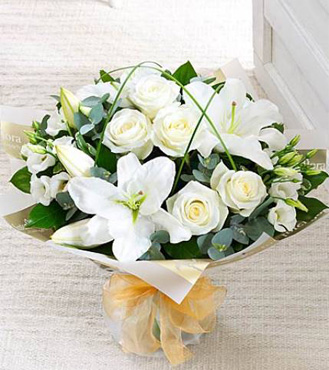 This is a very elegant, contemporary hand-tied bouquet. Groups of crisp white flowers are beautifully framed by loops of steel grass. It's simple in colour, but intricate in design, and the lilies give a sweet scent to the bouquet.