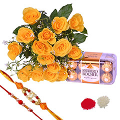 Your Gift Contains:• A Flower Bunch of 15 Yellow Roses• 16 Piece Ferrero Rocher Chocolates of 200gm• 1 Beaded Pearl Rakhi• 1 Elegant Beaded Rakhi• Roli and Chawal