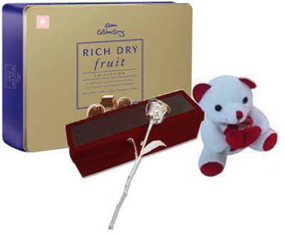 Cadbury Celebration Rich Dry Fruits with 6 inch teddy bear and 6 inch Silver Rose. This is the courier product and will deliver 3 to 5 working days.