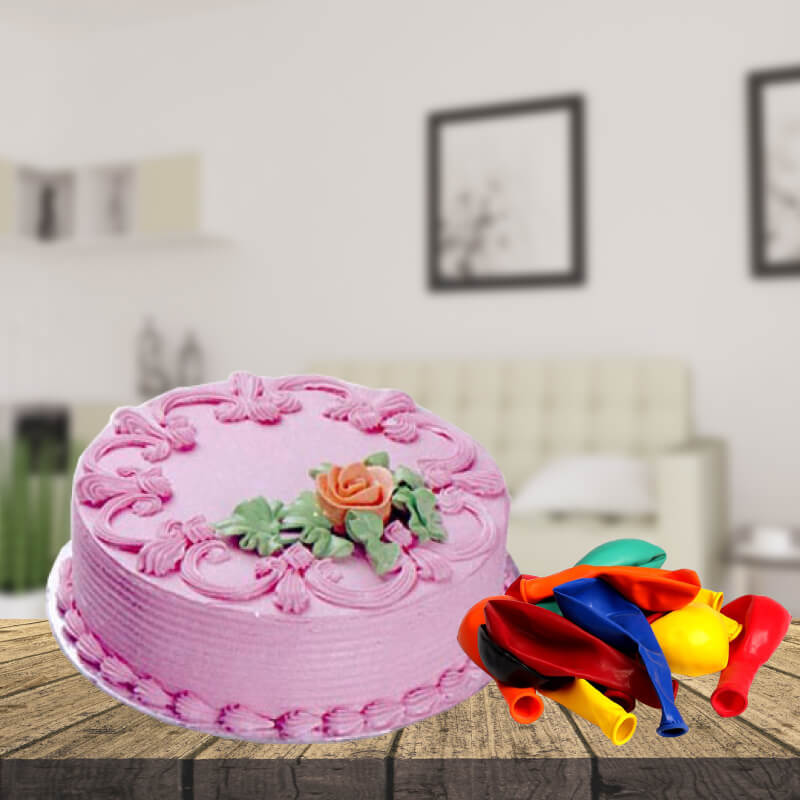 Cakes are always delectable; an appetizer which is savored by all, irrespective of the age. This special hamper includes 1 Kg Sponge Cake with strawberry flavoured icing and topped with whipped cream. The multi-colored balloons (6 Piece) is an added surprise.