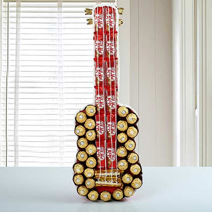 Chocolate is loved by everyone and that’s why this is a perfect gift for any occasion. So, treat your loved one's tastebuds with this delicious chocolate Nestle KitKat, Ferrero Rocher, and Cadbury Five Star chocolate are put together in the form of a guitar, which has a total length of 24 inches approx. and the strings are made with gorgeous golden Bakuli sticks. Order now from onlinedelivery.in