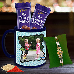 Make the interesting  occasion of Raksha Bandhan special for your brother as you gift him this hamper.  This hamper includes two Dairy Milk 34 gms each, a personalised photo mug, a beaded style rakhi, roli chawal and greeting card.