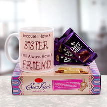 Raksha bandhan gifts, chocolates, coffee mug and soan papdi. Let the sweet sentiments flow and bring the joy in your sister's special day. Your Gift Contains: