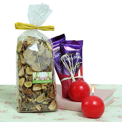Gift your friends and family this awesome arrangement to celebrate this Christmas Eve. Order Now! It contains Cadbury Dairy Milk Silk chocolates, Red Ball Candles, Brown Potpourri.