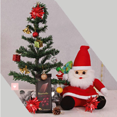 The best gift for Christmas is Christmas Tree clubbed with a Santa Claus. It comprises of a Christmas Tree along with Christmas Tree decorative items and Cadbury Bournville chocolate. This will add your love on this Christmas with fun and excitement. Christmas Tree height: 12 inches, 3 Red color star hanging, Christmas tree decor, Santa Claus, Bournville chocolate in flavor of Cranberry. This is courier products and will deliver 3 to 5 working days