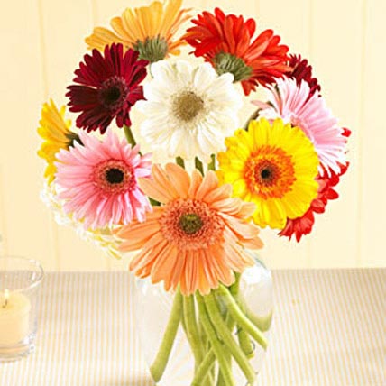 A simple yet elegant bouquet that will be loved by all. Walk an extra mile to get a smile on their face. These vibrant flowers are a collection of 12 multi color gerberas in a vase. Note: The flowers may slightly differ based on the availability.