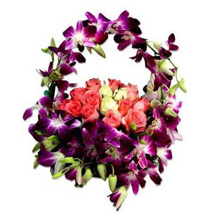 The arrangement of 14 pink roses, 3 White Roses, 12 purple Orchids. All arranged beautifully on handle basket as shown in the image. This is so sweet to resist anyone.