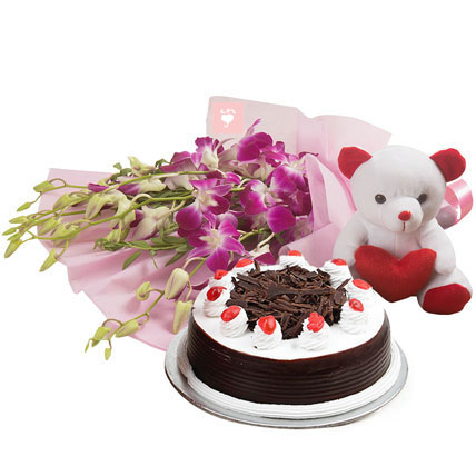 This combo consists of a bunch of 6 orchids, a 6 inch teddy and a half kg chocolate cake. Orchids stand for Love, Beauty and Refinement, the cute teddy shall bring a smile on the recipients face and the delicious chocolate cake is sure to enlighten their day.