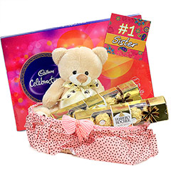Gift your sister this hamper which contains 141 gms celebrations pack, a cute soft toy, two Ferrero Rocher boxes with 5 pieces each, 1 basket and 'No.1 sister' message tag.
