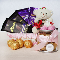 Reciprocate your sister’s love, which she shows by tying the best Rakhi on your wrist, with this yummy and chocolaty return gift on the auspicious occasion of Raksha Bandhan. She puts in all his heart and soul for making you feel loved and so, you should also do something that can make her feel delighted. All you need is to order this hamper!! It Contains: