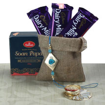 Send tasty dairy milk chocolates to your brothers along with this beautiful rakhi. We have also packed carefully three Cadbury chocolates a box of soan papdi for a lavish celebration. Your gift contains: