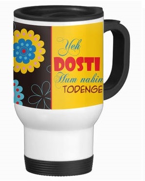 Soothing blue colored mug with flowers and eautiful text is the perfect way to thank your friend for always being there for you. On this Friendship day and send Dosti Travel mug to your friends and gift them a sweet memory of their life on this friendship day.