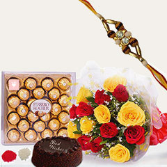 My prodect as:- bunch of mix roses there is a yummy cake with his favorite Ferrero Rocher chocolates and an elegant Rakhi to wear and flaunt on wrist.