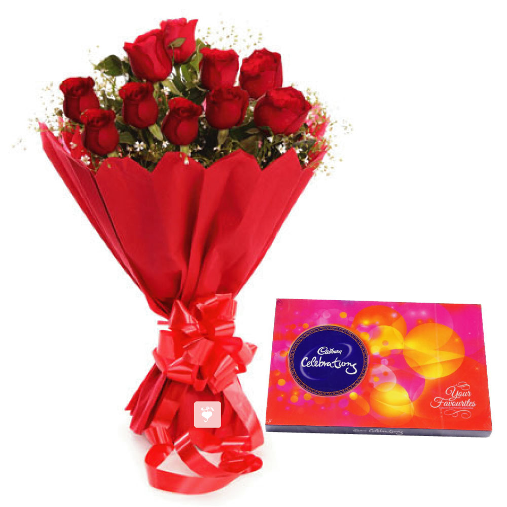 This gift set is an impressive symbol of your endless love. Timeless and elegant, this beautiful bouquet of 10 red roses in a red paper packaging and a red ribbon bow with the tempting Cadbury celebrations box are sure to please anyone and everyone. Your Gift Contains: