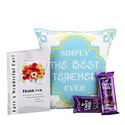 The way Teacher provided you knowledge so that you lead a comfortable life, provide your teacher with comfort through this alluring cushion specially designed to thank your teacher. Quoting “simply the Best Teacher ever”, this cushion along with a “Thank You” greeting card and 2 Dairy Milk chocolates of 13gms each will relay your love in the best manner.