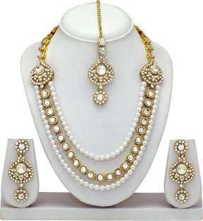 Are you looking for an elegant jewellery set that you can wear on your brother’s wedding? You can accentuate your look by teaming it up with a brocade lehenga or a half-saree and be sure of catching everyone’s attention.This jewel set consists of a three-layer necklace, a pair of earrings and a maang tikka, all of them feature beautiful designs.