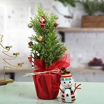 This good-looking hamper contains golden Cyprus plant in a plastic pot and Christmas tree decorative items with a thermacol snowman.