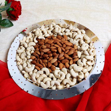 Express your heartfelt emotions to your families, friends and clients with this elegantly crafted silver round tray filled with dry fruits. This thoughtful and unique gift plate is beautifully arranged to please eye and palette. This is a gift that everyone can cherish for. Your Gift Contains: