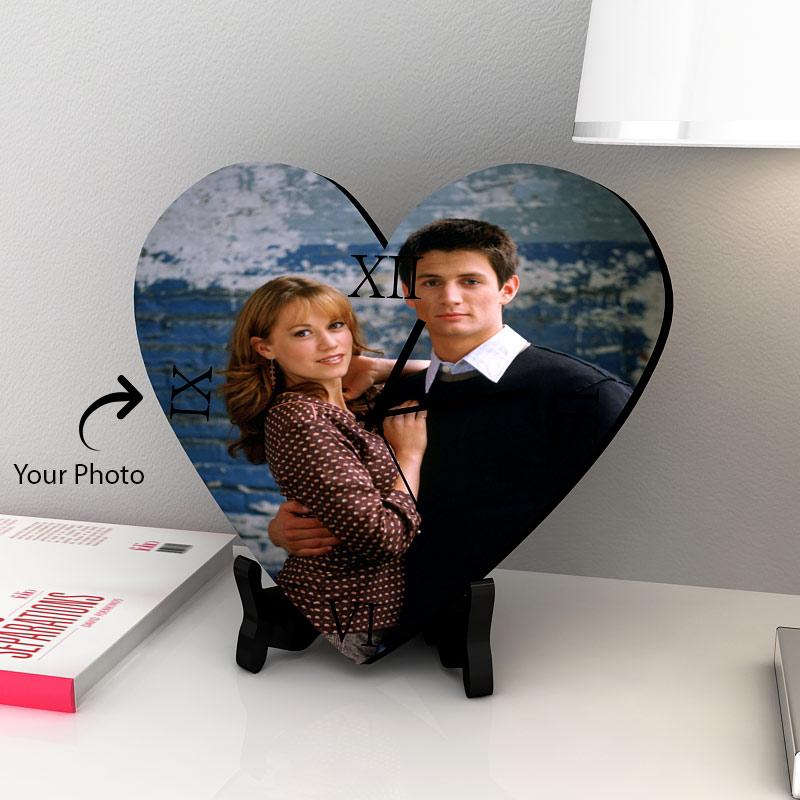 A heart shaped wooden clock with a stand and one photo looks amazing. It is 8x8 inch in size which can be placed on the study table of in the main room. It will make its own space wherever it will be placed. The photograph printed on the clock is printed on the body of the watch. This will be an ultimate gift which can be presented to your love on the special occasion of Valentine's Day. It will be relished for the entire life and will be treasured forever. Product Details: 8x8 inch Heart shape wooden clock with stand with one photo