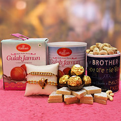 your big hamper of Kaju Katli, Gulab Jamun, Cashews, Ferrero Rocher, printed mug and two beautiful Sandalwood Rakhis on this Raksha Bandhan as a token of love.