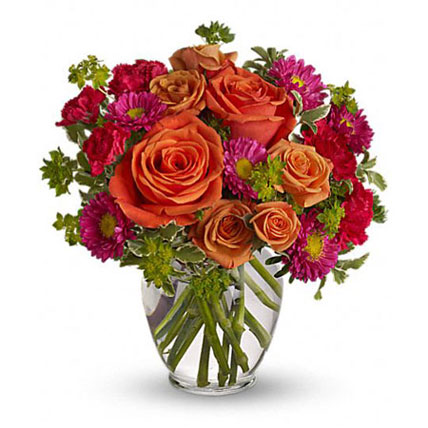 Send it to sweeten a best friend's birthday, say "hi" to mom, or delight your better half. Light orange roses, orange spray roses, and matsumoto asters, hot pink miniature carnations and more are delivered in a lovely glass vase.