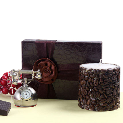 Celebrate the utmost love that you have for your near and dear ones by presenting them this adorable hamper comprising of an attractive coffee candle, a small telephone shaped watch showpiece and a box of assorted chocolates. Get this hamper and make your loved ones feel their importance in your life.