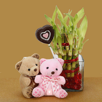 Lucky bamboo plant in a glass vase with red crystal in it along with 2 small teddy bear 6 inches each is the perfect for your dear one on this special occasion.