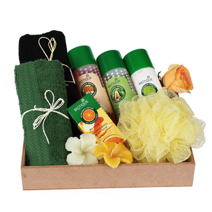 Pamper yourself with loads of luxuries of the revitalizing hamper available at Onlinedelivery.in. Get a hamper of Biotique gift range including 150 grams Orange Peel Body Soap, Body Wash, Massage Oil, and Skin Lotion 210 ml each and a Loofah. To add more to the pampering, we have also including 2 floating candles, 1 artificial rose and 1 green and 1 black hand towel to the package all beautifully packaged in a beautiful wooden box. Make your special one feel completely pampered and revitalized from head to toe.